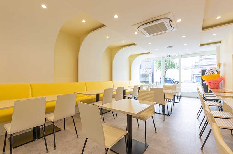 店内を解放的で明るい空間にしたいという思いから、天井はアーチ型の形状で視覚的な広がりをもたせ、ソファも黄色の暖色系カラーで統一。店内に入った瞬間に、仕事や日常で疲れた気持ちが、ぱっと明るくなってもらえるよう、温かみと明るさにこだわったインテリアです。ぜひ、当店で寛ぎ、心と体を癒していただければ幸いです。